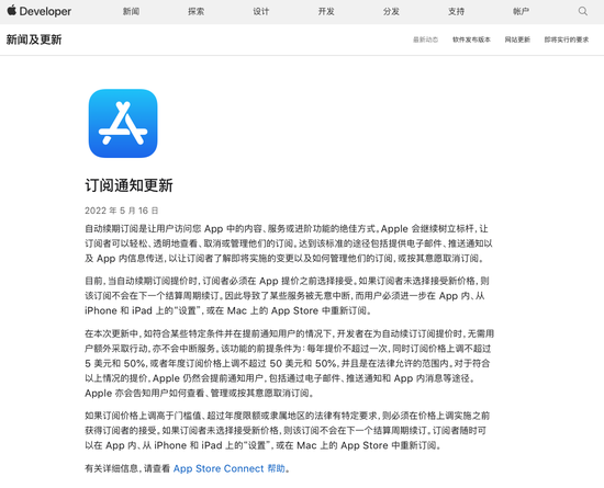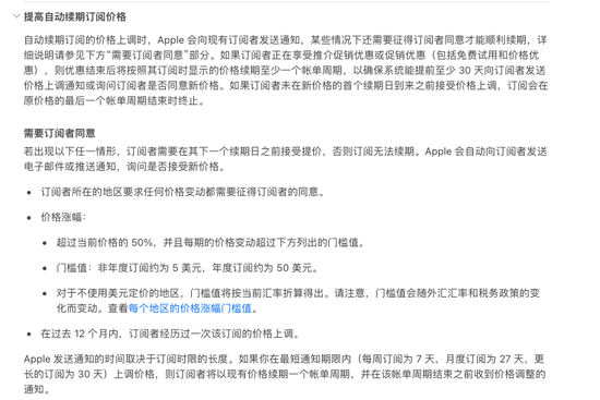 5 月時(shí)候,蘋果在國外大部分 App Store 開始實(shí)施一項(xiàng)新的做法,也就是在充分告知用戶的前提的情況下,在一定限制條件下的開發(fā)者的續(xù)訂提價(jià)可以無需用戶進(jìn)行額外操作。